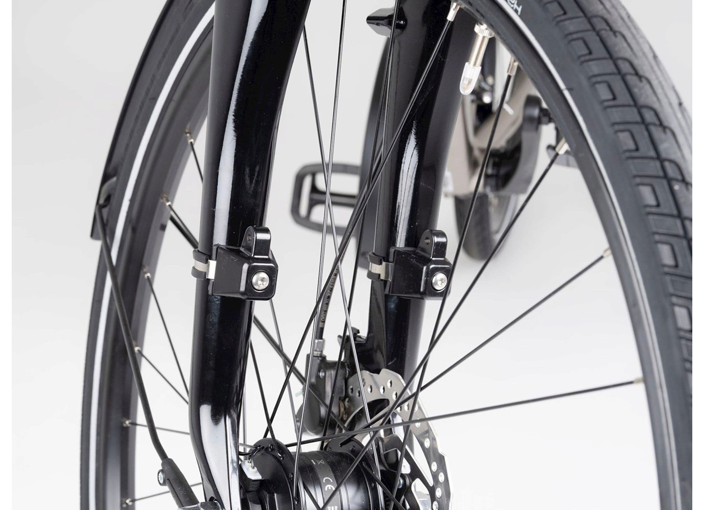 2. Själva pakethållaren fästs i framgaffeln (ofta sitter en lampa här, montera av den)