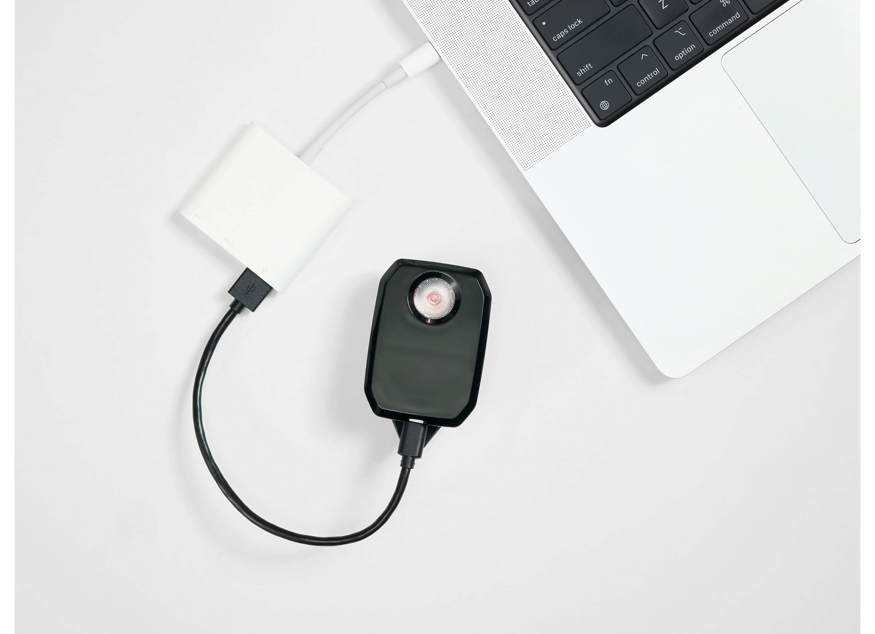 CarBack levereras med snabbfästet Quick Connect Plus för smidig bakmontering samt en USB-C-laddkabel för enkel uppladdning.