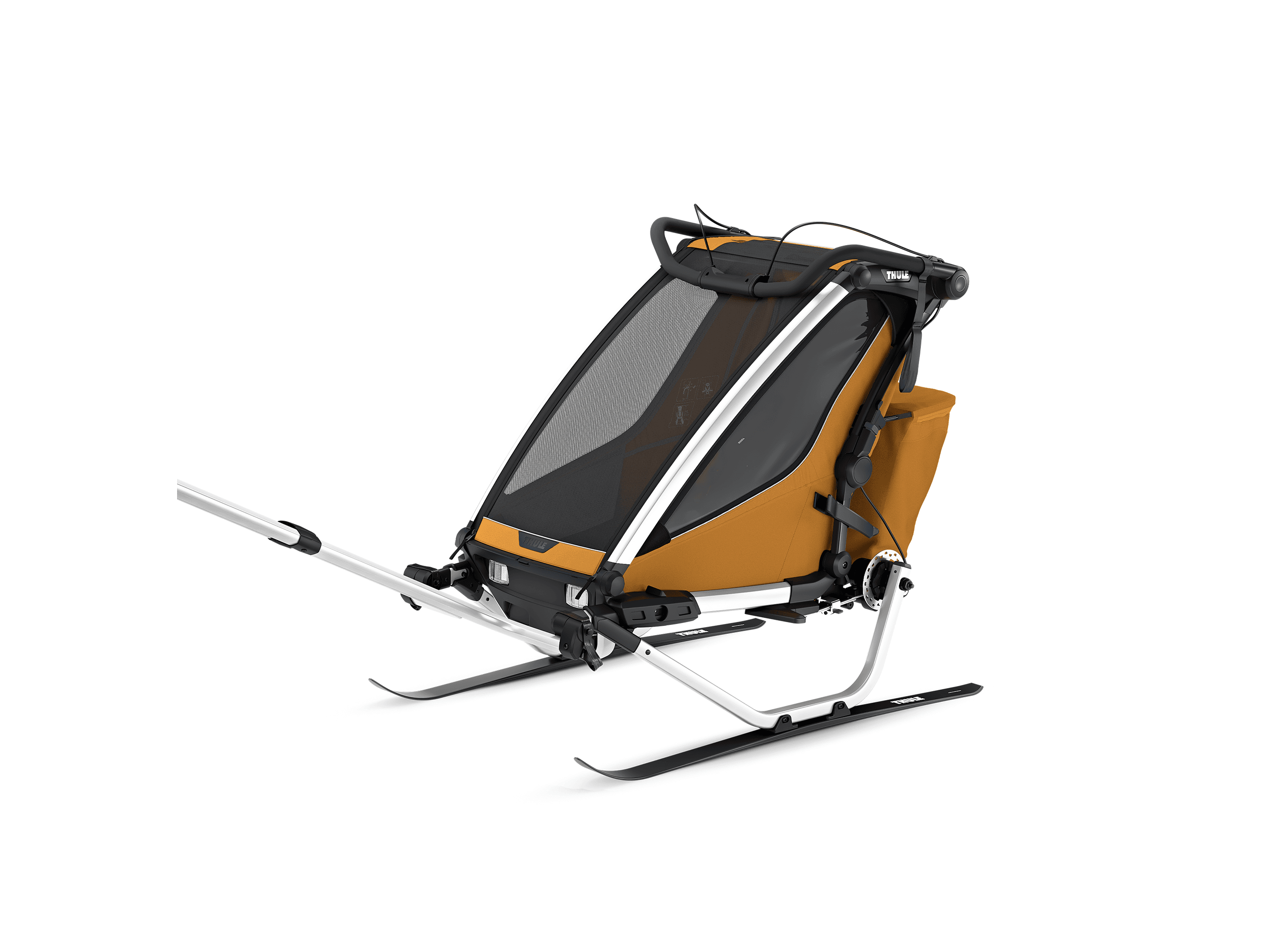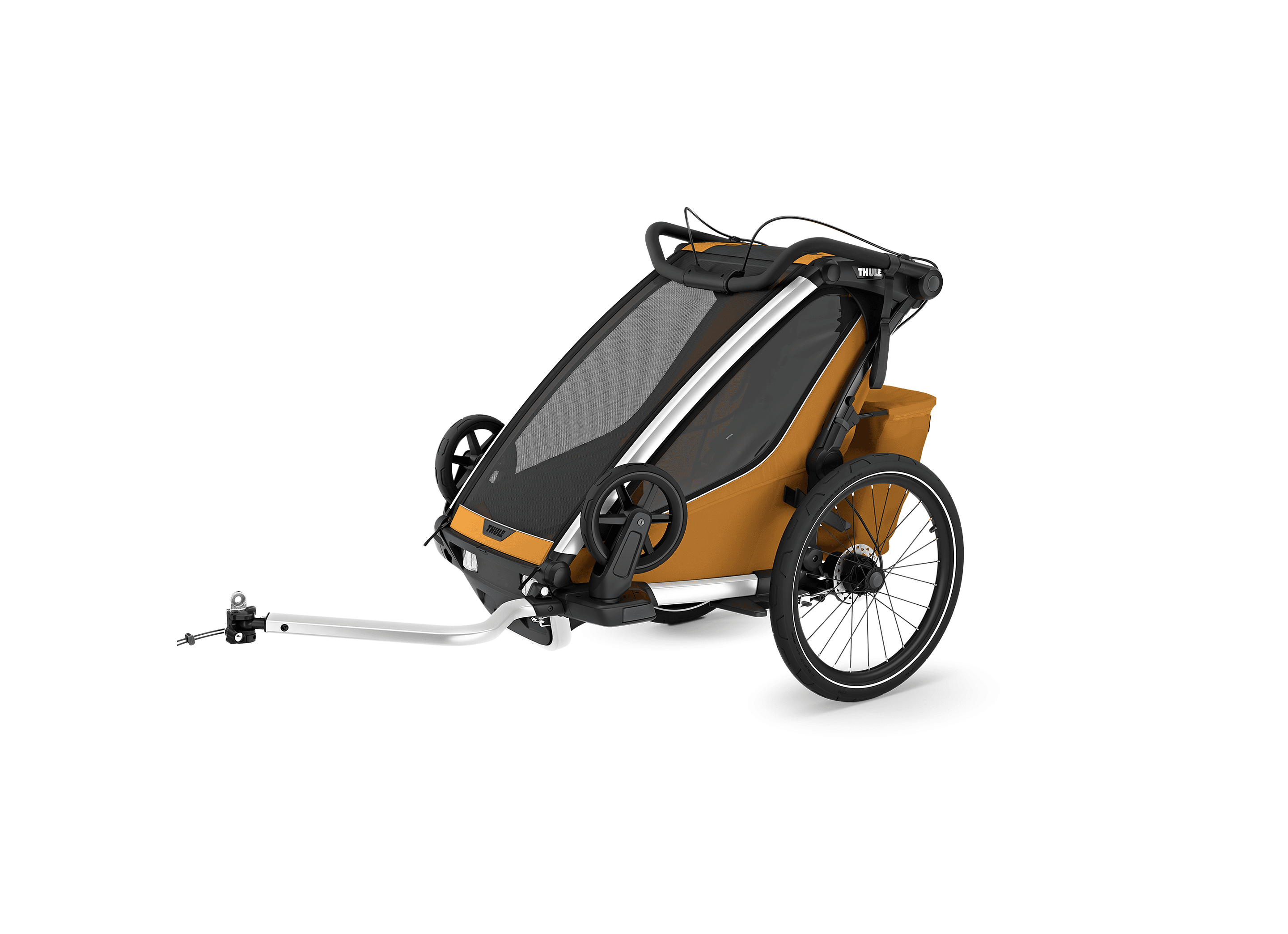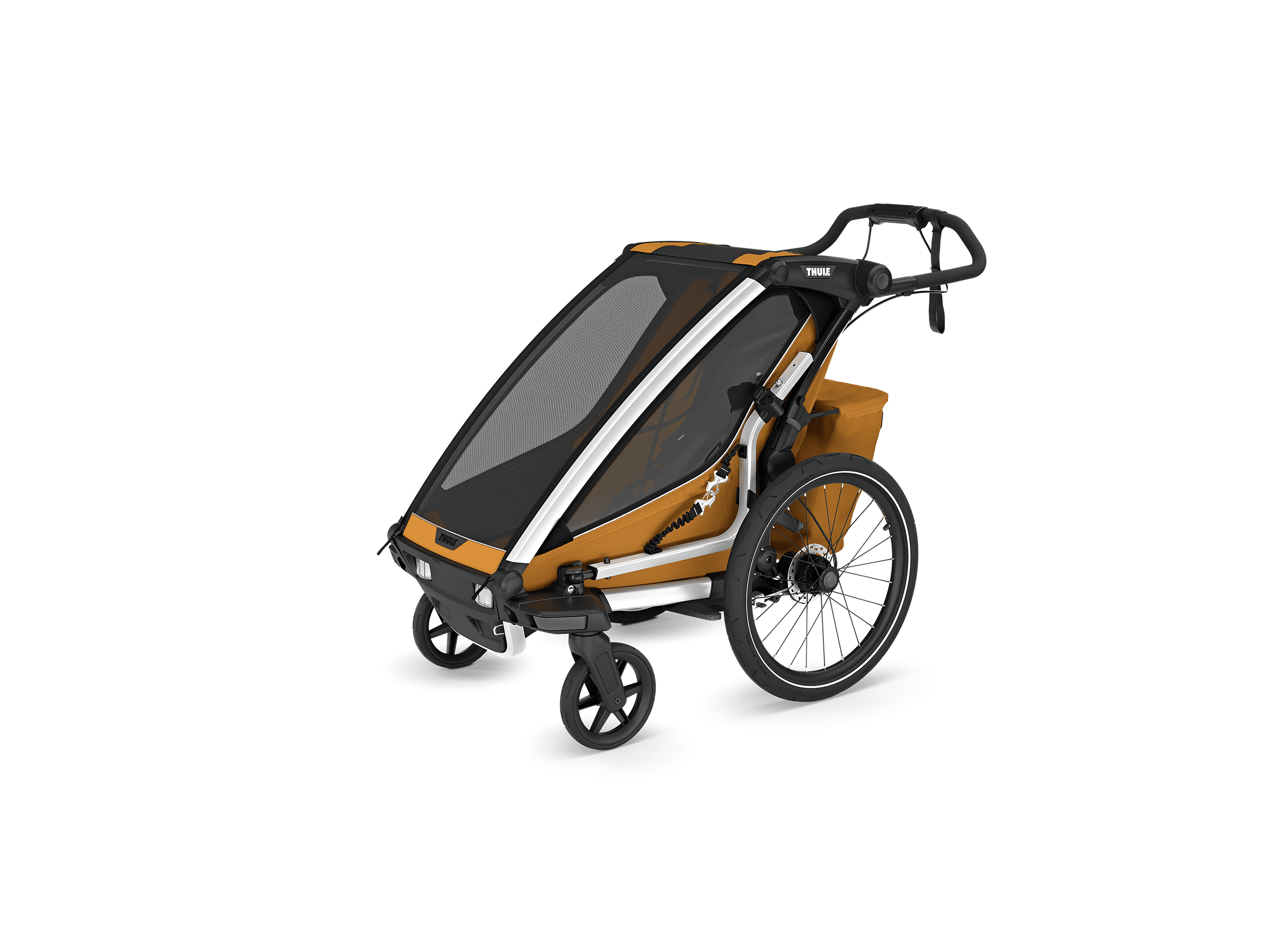 Denna mångsidiga vagn är perfekt för cykling, jogging, promenader och skidåkning. Kompatibel med tillbehör för jogging och längdskidåkning (säljs separat). Medföljande regnskydd och solskydd håller barnet torrt och skyddat i alla väder.